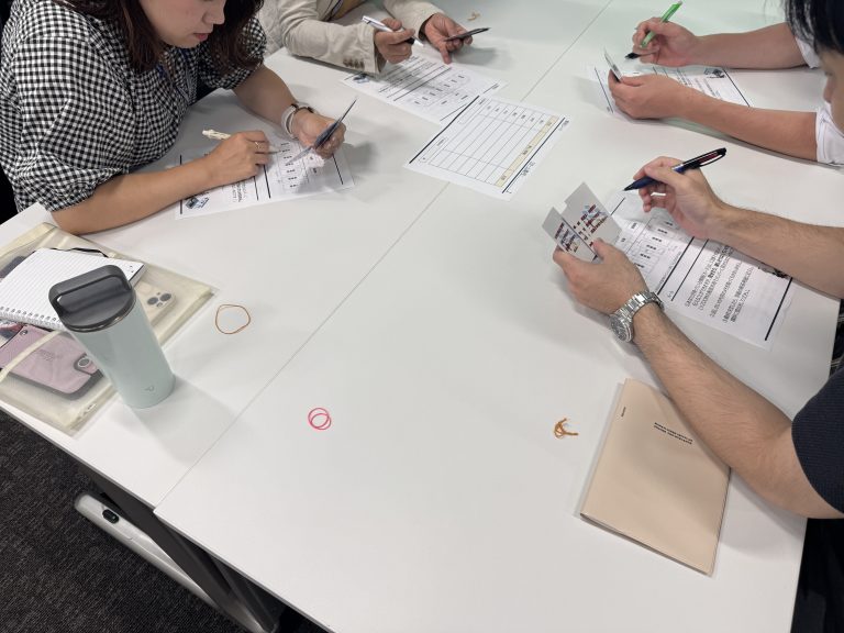 受講生の皆さまは、7 人の人事異動当てゲームに真剣な眼差しで取り組んでいらっしゃいました。最初にルールが説明されると、「これはどういって話し合ったら良いのだろう?」、「どう整理すればいいのだろう?」と、興味津々の表情を見せ、スタートと同時に各チームで一斉に話し合いが始まっていきました。限られた情報を手掛かりに推理を進めていくため、まずはメモを取りながら事実と推測を分けて整理する姿が多く見られました。