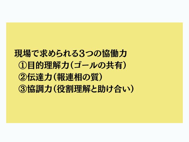 現場では、「なぜこの作業を行うのか」「どのような完成形を目指しているのか」を全員が理解していなければ、動きがバラバラになります。目的理解力とは、上からの指示を受けるだけでなく、“自分たちの仕事が全体の中でどんな意味を持つのか”を考え、共有する力です。これがあるチームほど、判断が早く、ミスが少なく、主体的に動ける傾向があります。②伝達力(報連相の精度を高める力)