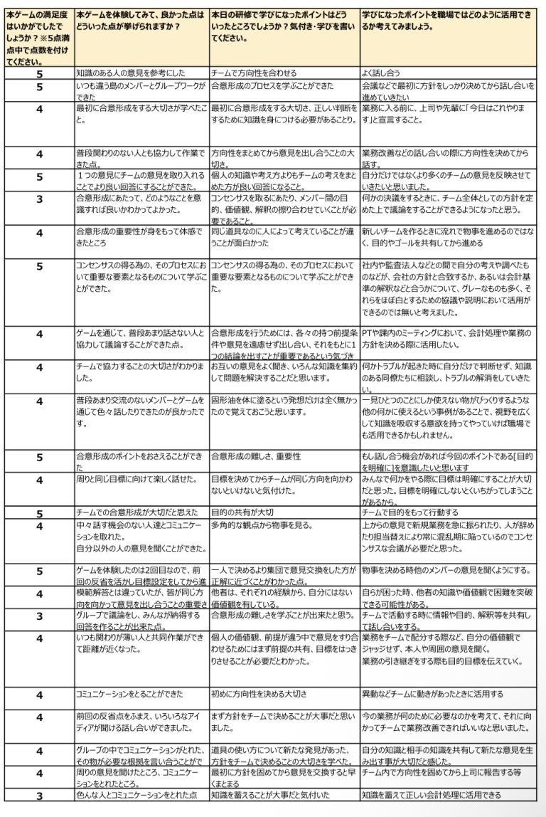 ゲームの後半で、専門家の「正解」と自分たちの結果を照らし合わせた瞬間、多くの参加者が衝撃を受けます。 「思っていたよりも自分たちの判断がズレていた」「議論中にあの意見をもっと深めていれば…」といった後悔や驚きが、次の行動への原動力になります。 この体験は、単なる反省ではなく、「議論の質」を可視化する貴重なプロセスです。どのタイミングで意思決定の方向が変わったのか、どんな根拠で判断したのかを分析することで、今後の仕事の中でも「より良い判断プロセス」を意識できるようになります。つまり、ゲームは単なる知識の伝達ではなく、思考習慣を再構築する“思考のリハーサル”なのです。 最終的にこのゲームがもたらすのは、“反省”ではなく“成長のきっかけ”です。 自分の判断が間違っていたと気づくことは、誰にとっても痛みを伴います。しかし、安全な環境での失敗は、むしろ次の挑戦への自信を育てます。参加者の多くが、「これからの仕事では自分の考えを持って発言したい」「チームでの議論をもっと大切にしたい」といった前向きな言葉を残します。 このような行動変容は、ゲームが単なる知識習得型ではなく、**“体験による内省型学習”**であることの証です。自らの思考の限界を知り、他者の意見を取り入れる柔軟性を得る——これこそが、現場で求められる“意思決定力の進化”なのです。掲載事例用ゲームの実施後アンケート